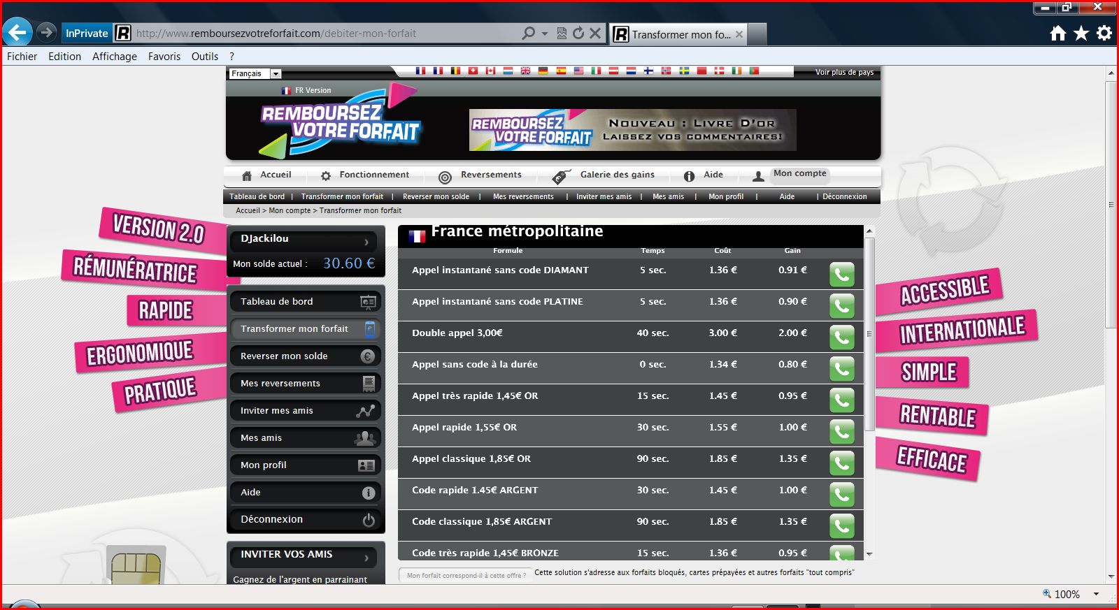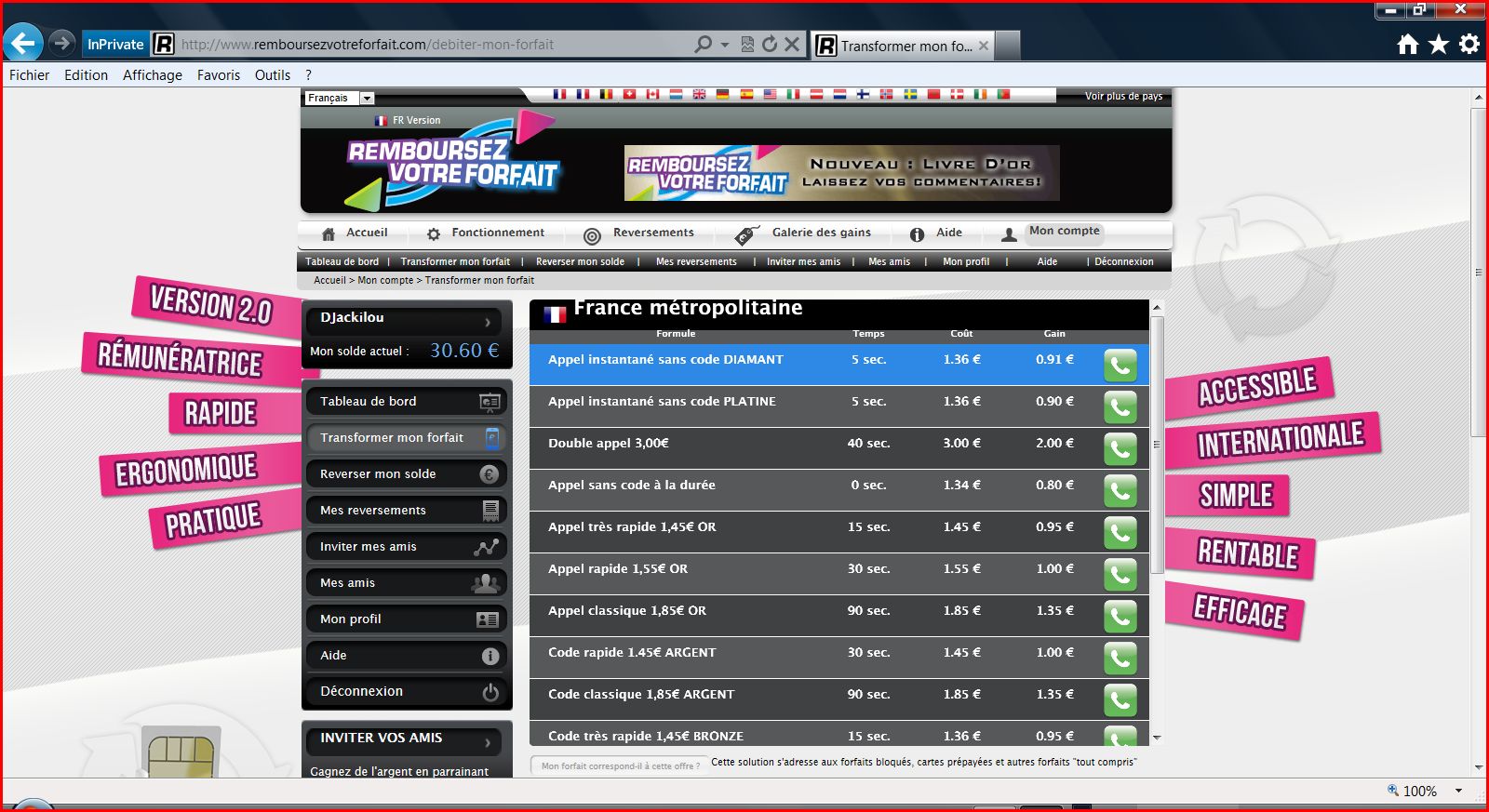 - Point très important : le site indique des taux de reversement pouvant aller jusqu’à 75% pour les numéros les plus rémunérateurs. Cela n'est pas la réalité. En effet, dans mon cas étant chez SFR avec un forfait carré bloqué, par exemple en utilisant l' « appel instantané sans code PLATINE » (le deuxième dans l’onglet transformez mon forfait))( celui que j'utilise le plus souvent car l'un des plus rémunérateur), le site indique un débit sur votre forfait de 1.36€ pour un appel de 5 secondes avec un reversement de 0.90€. Or, sur votre forfait il vous est en réalité débité 1.46€ en moyenne (si vous raccrochez immédiatement après la fin de l’appel). On est donc loin des 75% de reversement affiché, mais plutôt au alentour des 62%. C'est le site qui à l'un des taux de reversement les plus important. J'en ai utilisé un qui ne reversait que 0.73€ pour le même débit sur mon forfait.